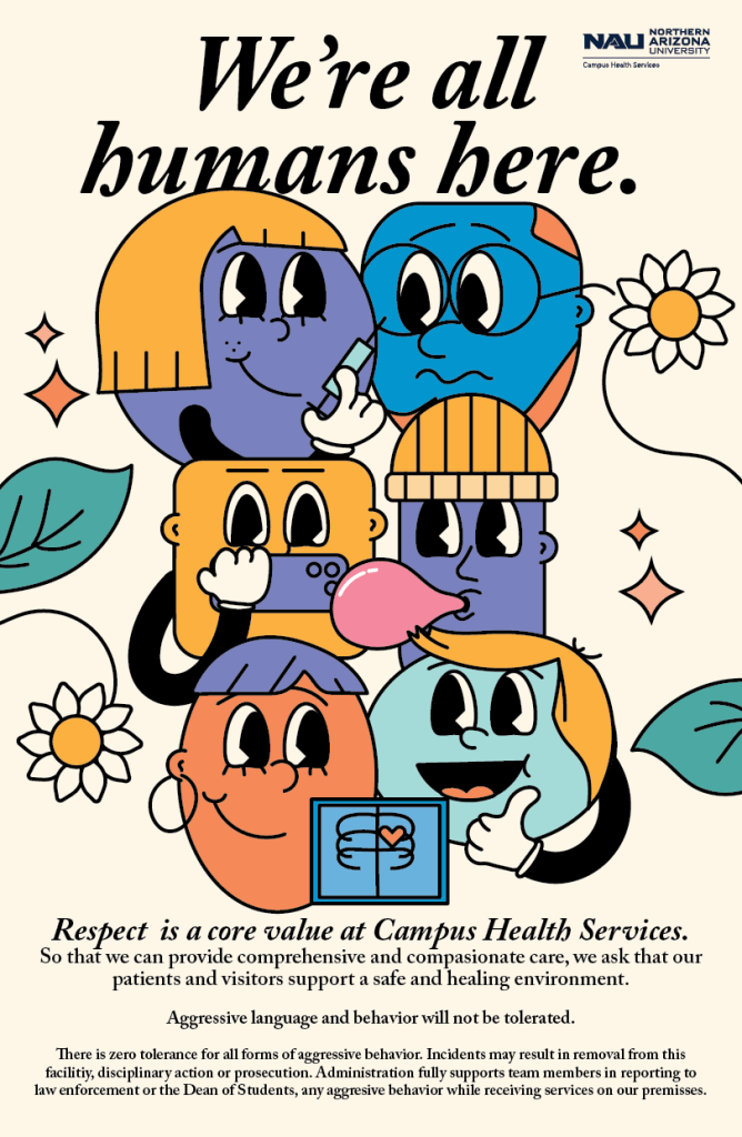Healthcare workers are heroes. Period. NAU’s nursing staff had seen an uptick in rude and disrespectful behavior. We created a variety of signage to hang up around the facility space to remind people to be kind and patient.
